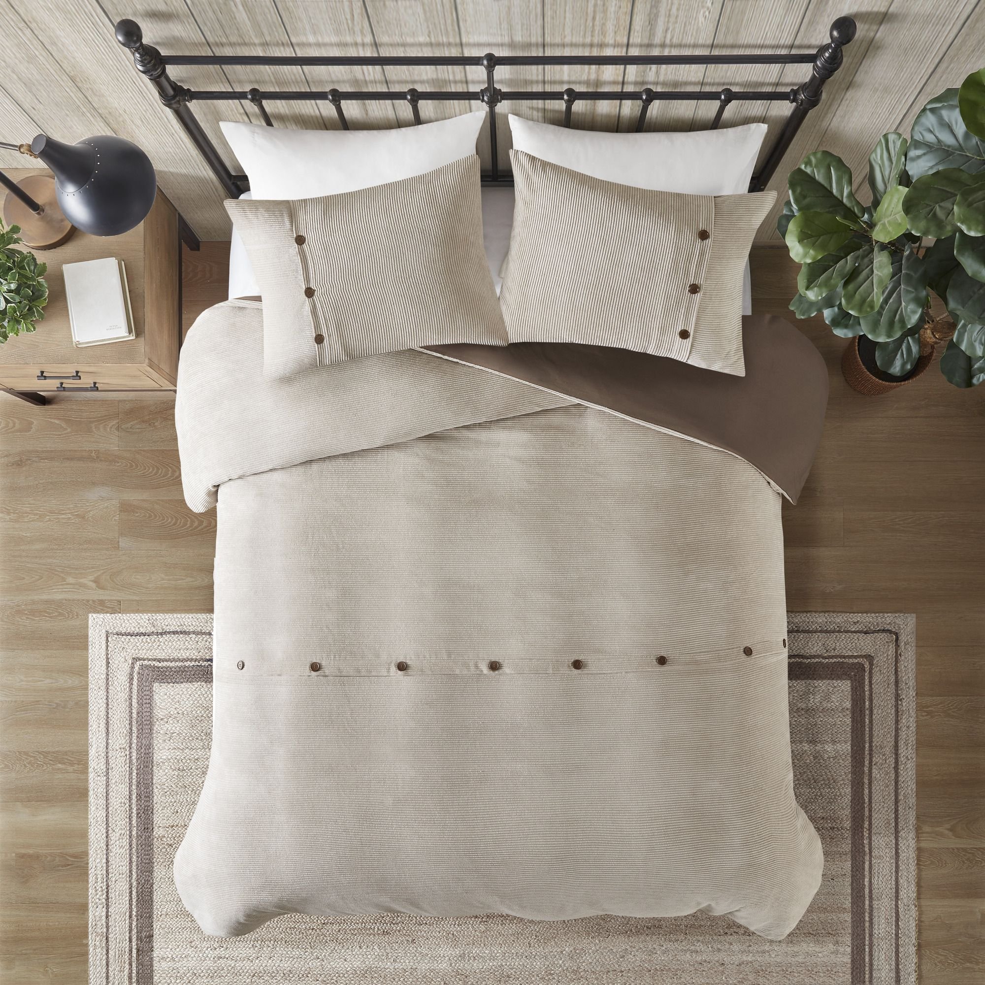 Soft tan color with beige buttons on duvet cover with a solid rich brown reverse