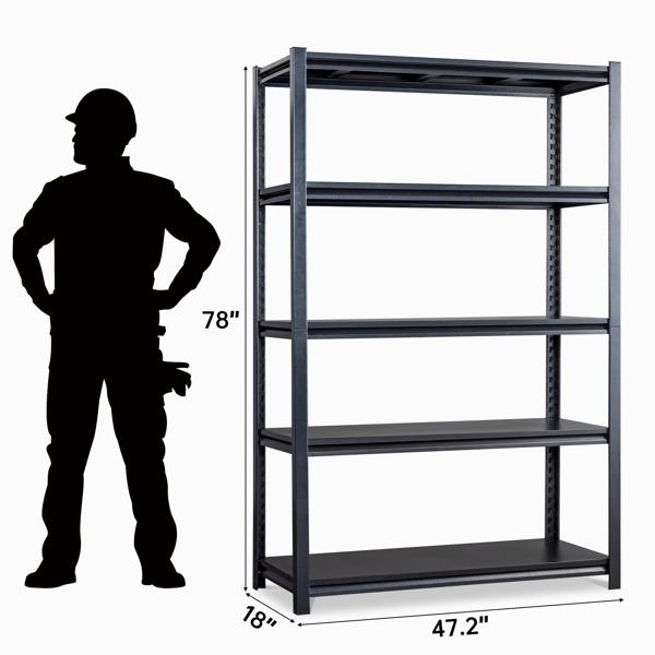 1. 2200LBS Heavy Duty Capacity: Crafted from all-metal materials, this robust shelving unit offers a load capacity of 440 lbs per shelf (evenly distributed), supporting a total of 2200 lbs. Perfect for storing heavy-duty items like garage equipment, tools, tires, or pantry goods.