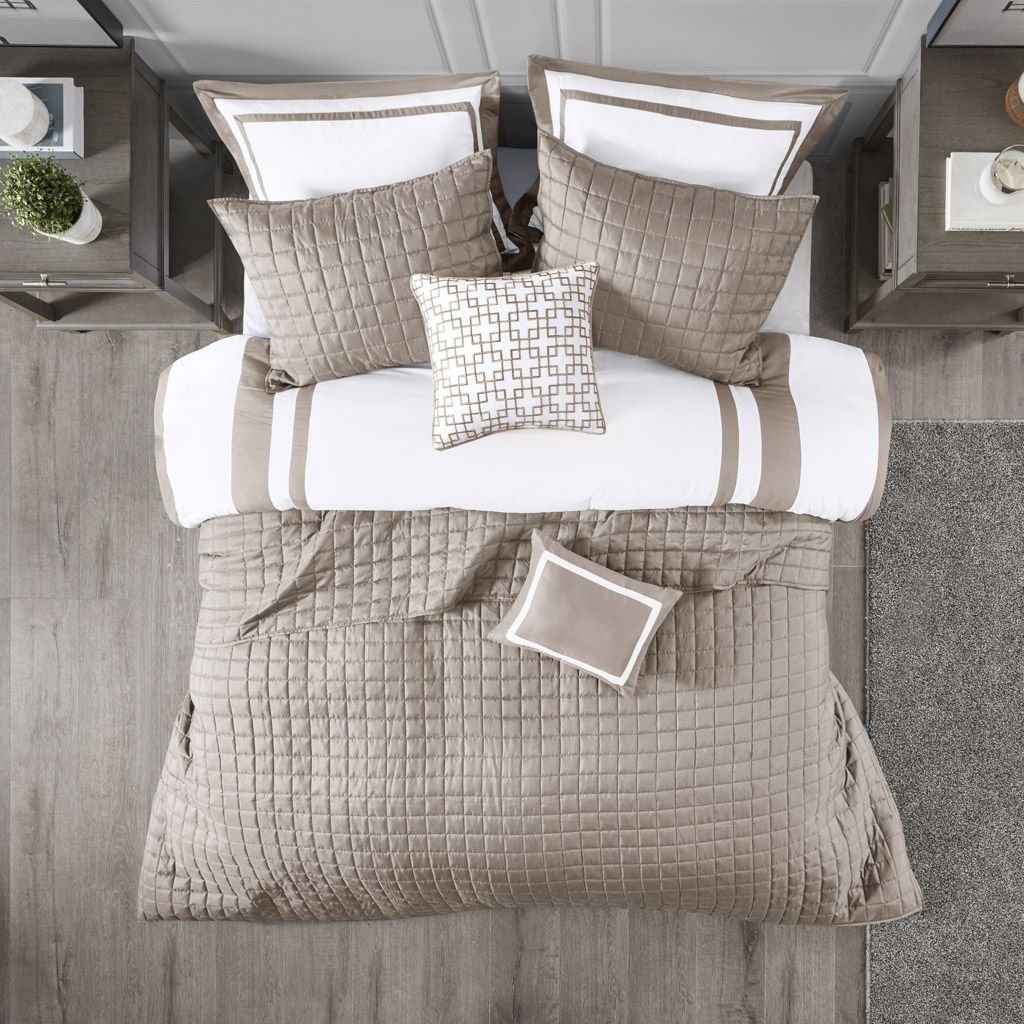 This Heritage hotel bedding collection includes a comforter and quilt that both come with matching shams to complete a luxurious layered look. The soft comforter and shams showcase a bold border on a white ground with a solid white reverse, while the lightweight quilt and its shams display a window pane end-to-end quilting pattern. Two decorative pillows, one square and one oblong with embroidered and pieced details provide the perfect finishing touches to this 8 piece bedding set. This set is available in grey, navy, and taupe options. Machine washable for easy care, this collection is great for year-round use.