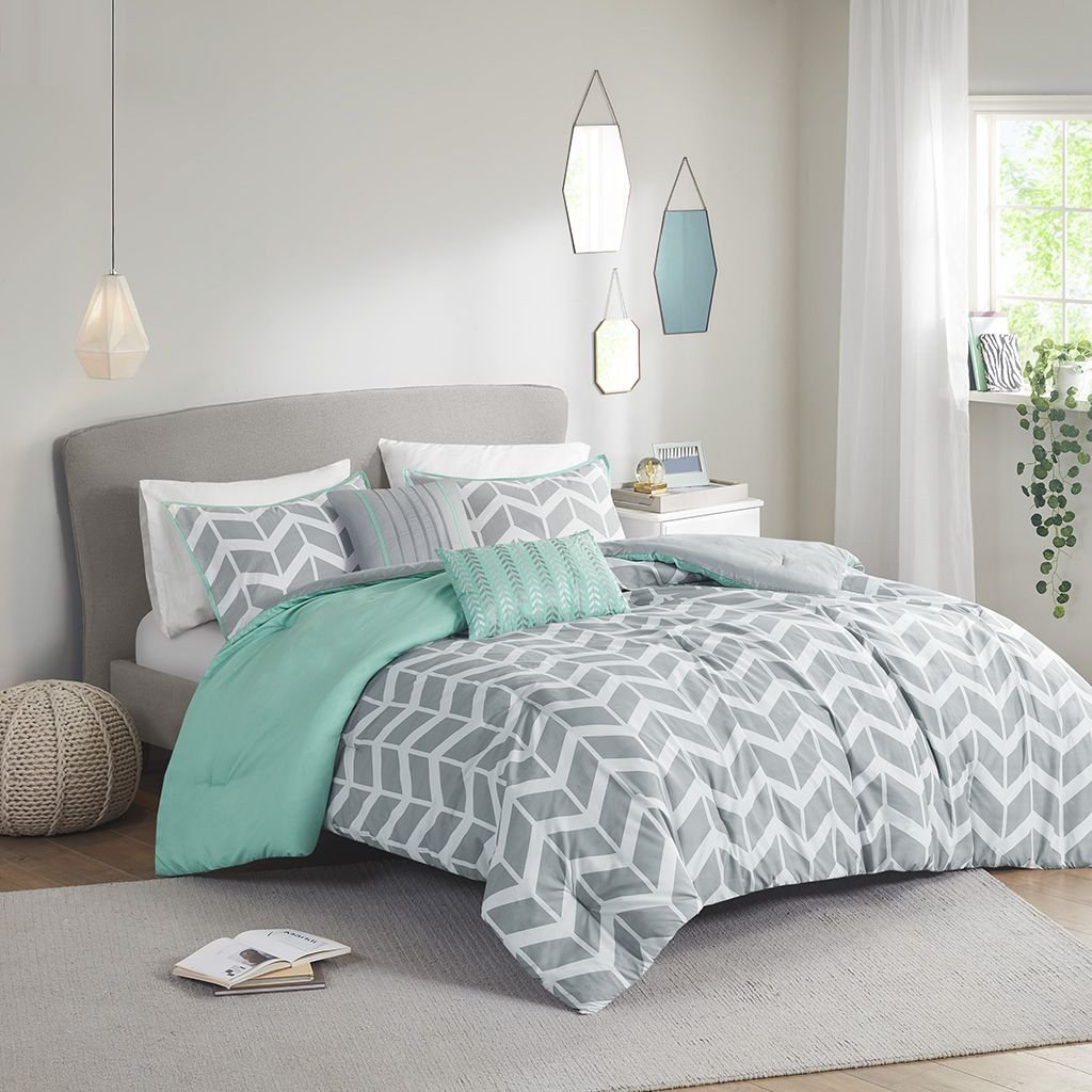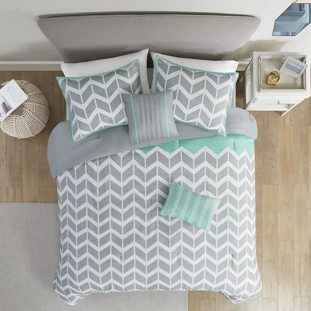 The Intelligent Design Nadia Comforter Set updates any bedroom into fun and inviting space. This stylish comforter features a grey and white chevron print broken up by white vertical stripes and a solid aqua at the top that pops! The 2 matching shams (1 in Twin/TwinXL) with an aqua flange pairs perfectly with the delightful chevron pattern, while 2 decorative pillows in coordinating colors help complete the look. Made from ultra-soft microfiber, this comforter set is machine washable for easy care. This bedding set uses an antimicrobial treatment that provides built-in freshness protection, reducing the growth of odor causing bacteria to keep fabric lasting longer.