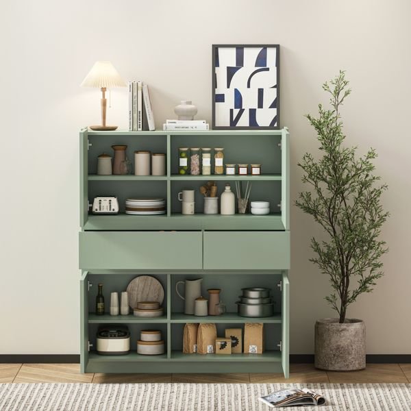 Green wooden storage cabinet with 4 doors and 2 drawers