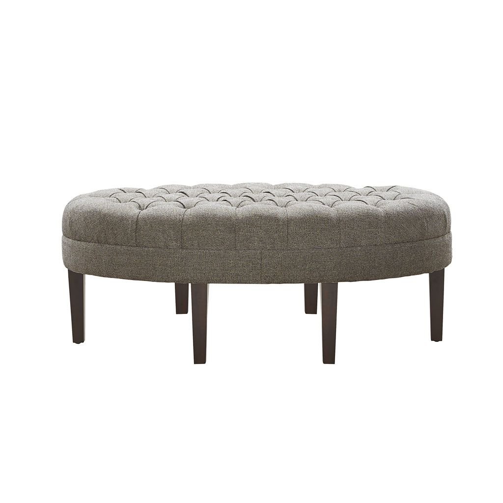 Prop up your feet and relax with the Madison Park Martin Surfboard Tufted Ottoman. This upholstered oval-shaped ottoman features a button tufted top that adds an elegant modern look. Solid wood straight legs with dark finish create a rich and striking contrast. Use this tufted ottoman as the perfect centerpiece in your living room to complete your decor. Only leg assembly is required. Spot clean or professional steam clean.