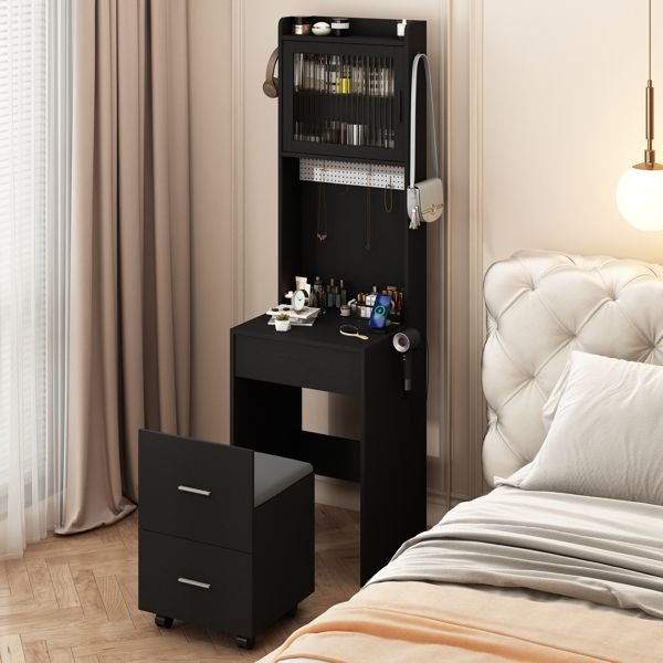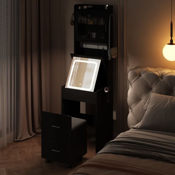 Transform your small space into a stylish and functional beauty station with this compact vanity desk set. Designed with space-saving features, it offers a clever combination of a flip-top mirror, ample storage, and a comfortable stool, perfect for small bedrooms or apartments. The sleek, modern design is enhanced by adjustable LED lighting and built-in charging stations, making your daily routine more convenient and enjoyable. Whether you're prepping for the day or winding down at night, this vanity set offers everything you need to create a clutter-free, elegant beauty corner.